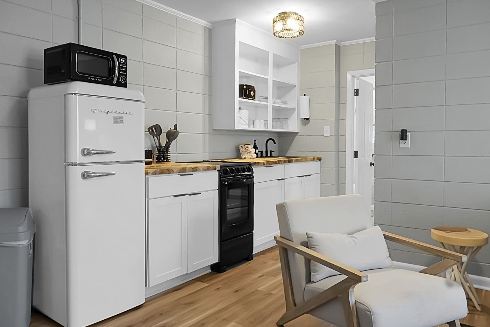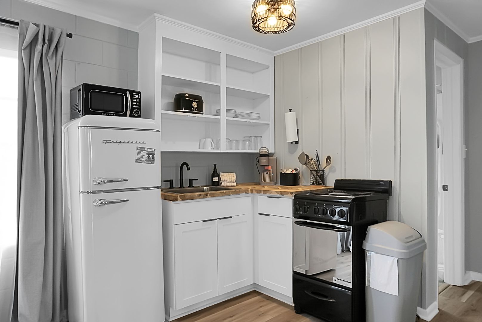 A compact room at Seabirds Motel at Kure Beach with a small microwave, mini-fridge, and coffee maker on a wooden cabinet. The room offers convenient amenities for a pet-friendly lodging experience in North Carolina.