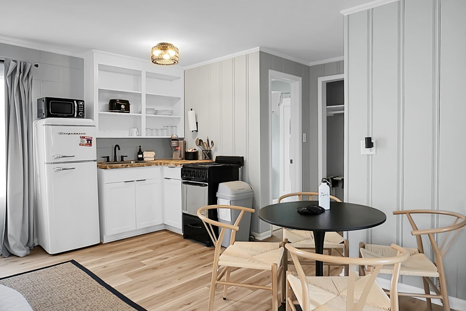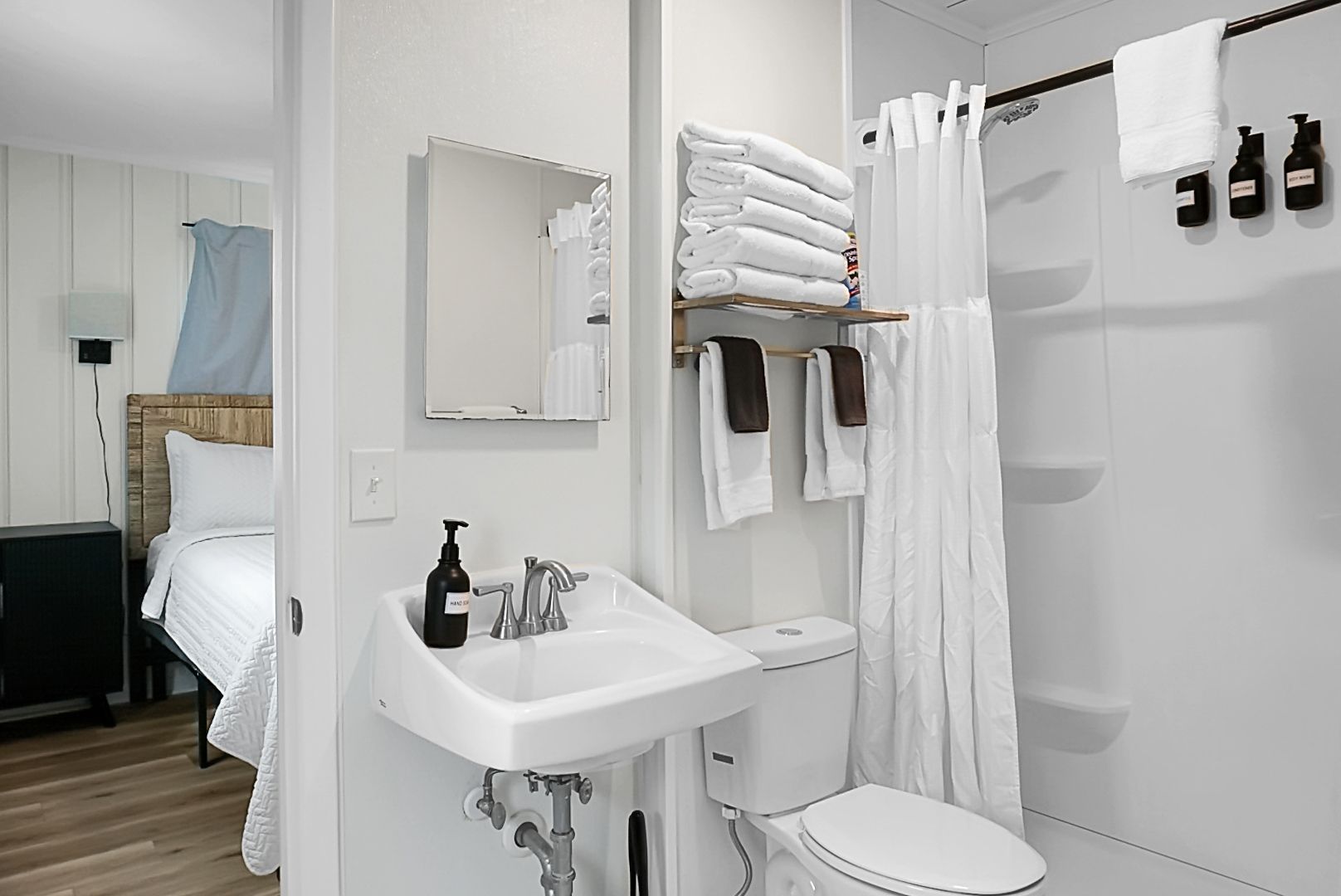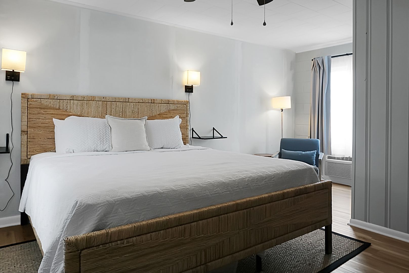 A bright guest room at Seabirds Motel at Kure Beach with a queen-sized bed, white linens, and minimalist decor. This room offers a comfortable environment for a pet-friendly stay in North Carolina.