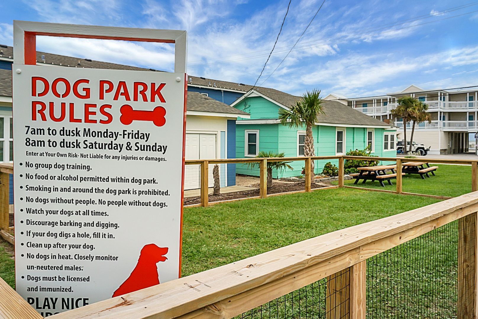 A fenced-in grassy area at Seabirds Motel at Kure Beach, designed for pets to play safely. This outdoor space emphasizes the motel's pet-friendly policy and commitment to providing a welcoming environment for pets and their owners in North Carolina.