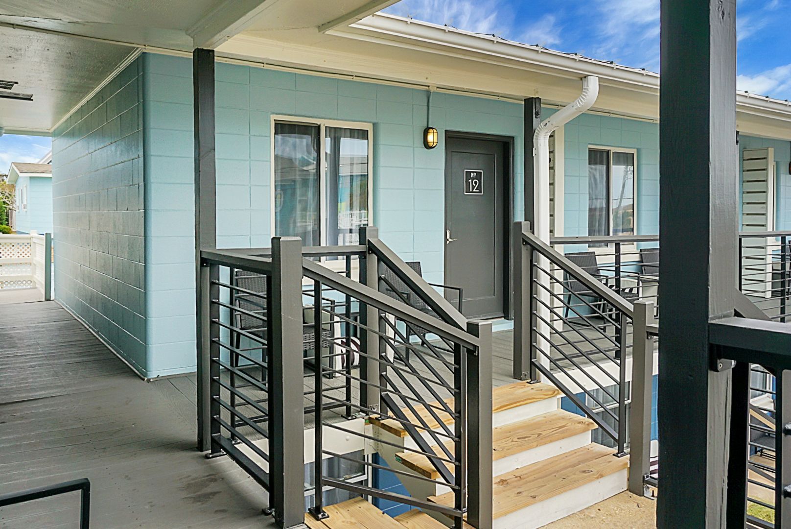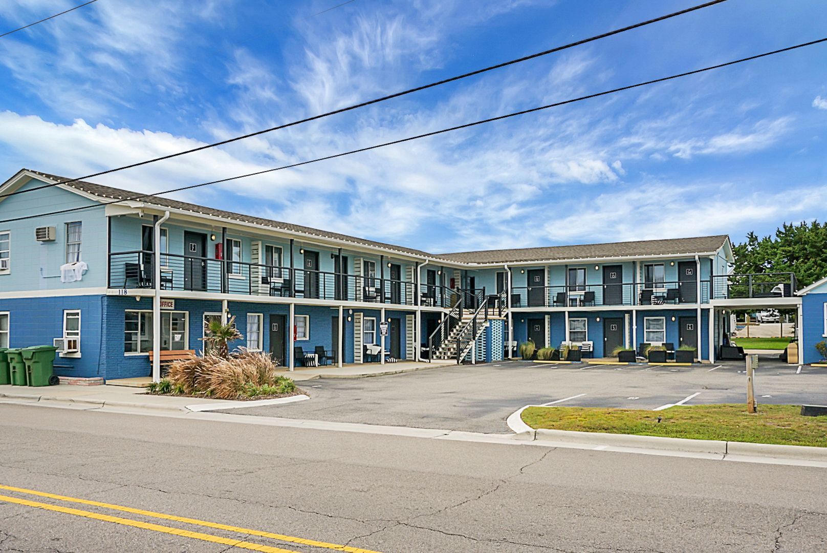 The exterior of Seabirds Motel at Kure Beach painted in bright blue with outdoor seating. The cheerful facade reflects the welcoming, pet-friendly atmosphere of this North Carolina lodging.